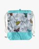 - Motyw: Motylki – dziewczęcy wzór z rustykalnymi kwiatami i kolorowymi motylami na białym tle, w połączeniu z miętowym wykończeniem worko-plecaka.
